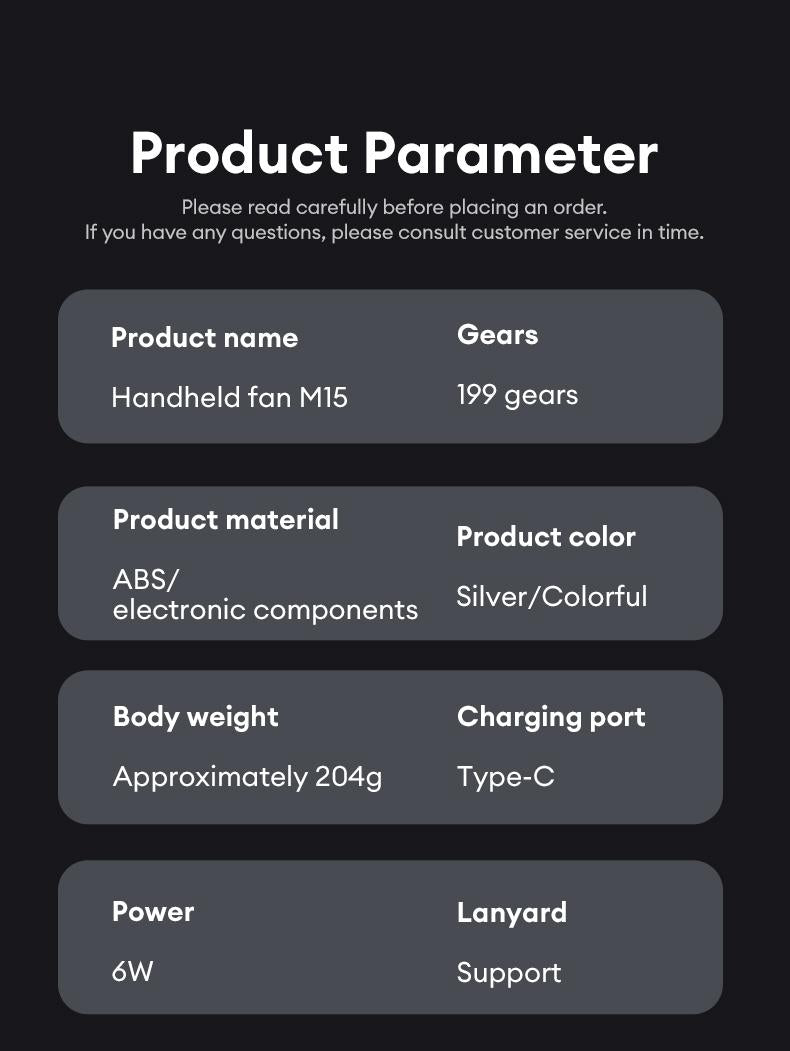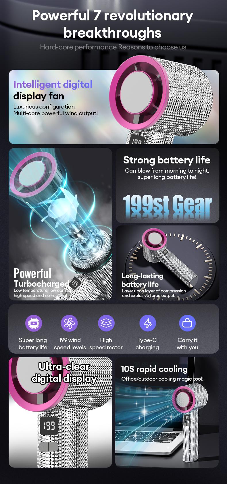 Portable handheld turbo fan with 3 wind gears and 199 adjustable levels.