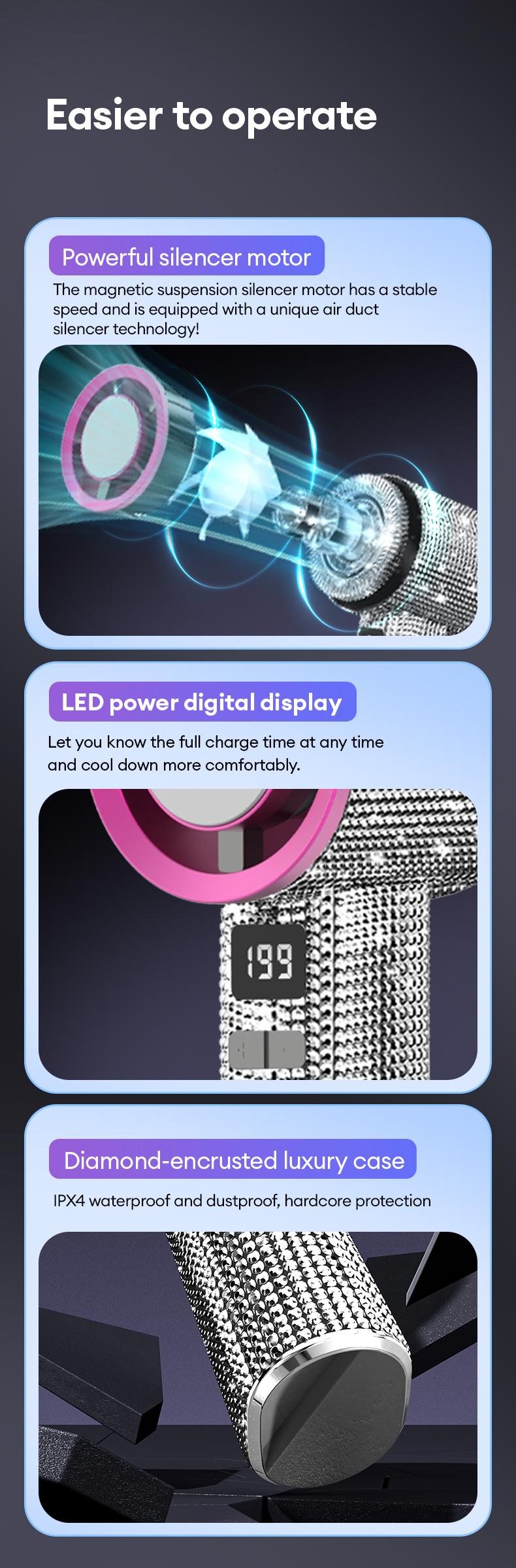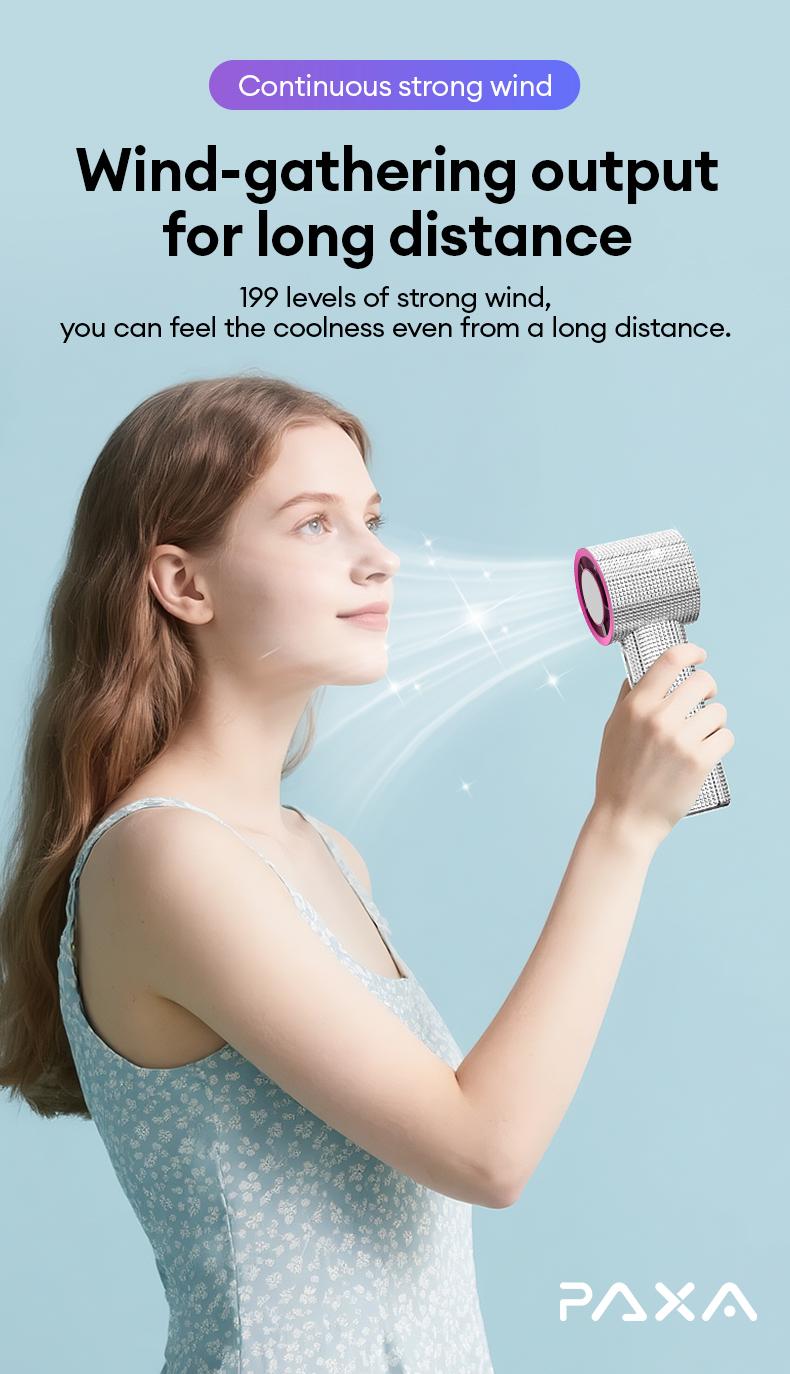 Ever been stuck outside on a hot day wishing for a stylish way to cool off? Meet the PAXA M15 Full Diamond Luxury Portable Handheld Turbo Fan, your new best friend for beating the heat with flair. This fan combines dazzling diamond craftsmanship with powerful performance, featuring 3 wind gears and an impressive 199-level adjustment to customize your breeze just right. Its rechargeable battery keeps you cool for hours, whether you’re hiking, commuting, or working at your desk. The ultra-clear digital display shows wind speed and battery status, so you’re always in control. Plus, it’s lightweight, waterproof, and whisper-quiet thanks to its magnetic suspension silencer motor. Need a quick hair dry? Flip the switch and use the fan as a hair dryer in seconds. Each fan comes with a chic lanyard for easy carrying, making it the perfect gift for yourself or someone special. Stay cool, look cool—grab your PAXA M15 and breeze through your day with confidence!