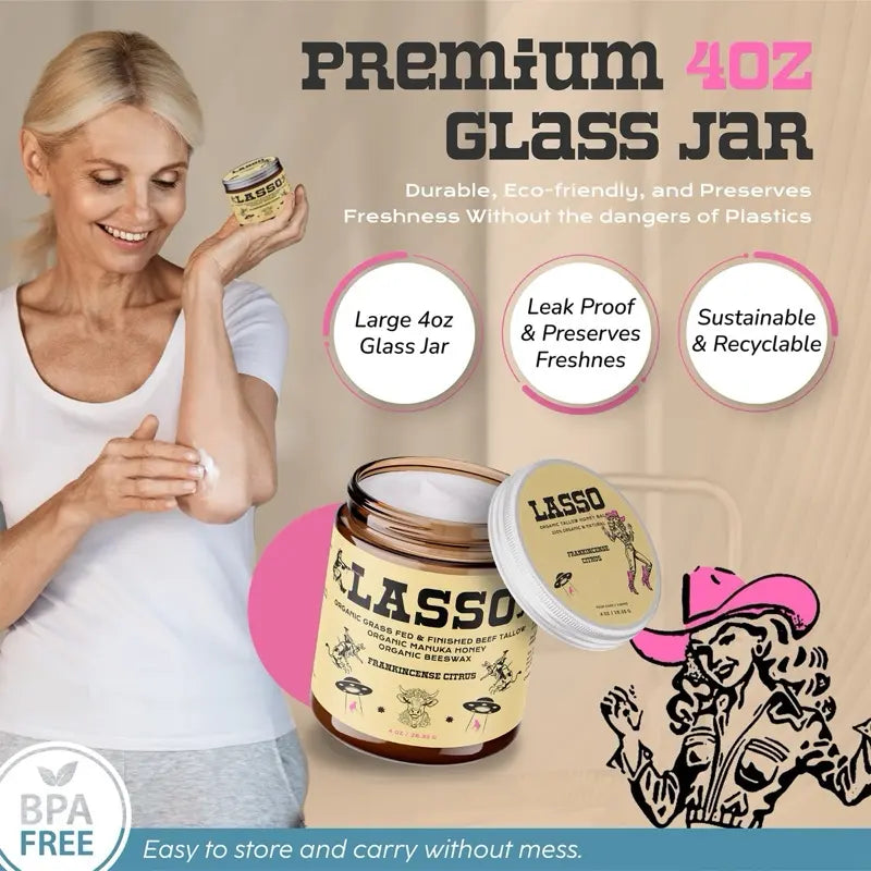 Experience soft, smooth, rejuvenated skin with Lasso Organic Beef Tallow, Beeswax, & Manuka Honey Balm—the natural choice for healthy, glowing skin!